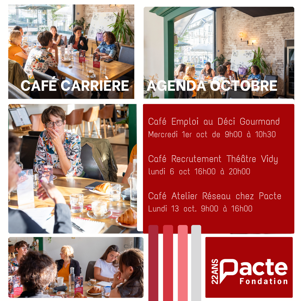 Depuis 2019, la Fondation Pacte anime des rencontres Cafés : espaces d’accompagnement, d’écoute et de mise en réseau destinées aux femmes en réinsertion ou en réorientation.